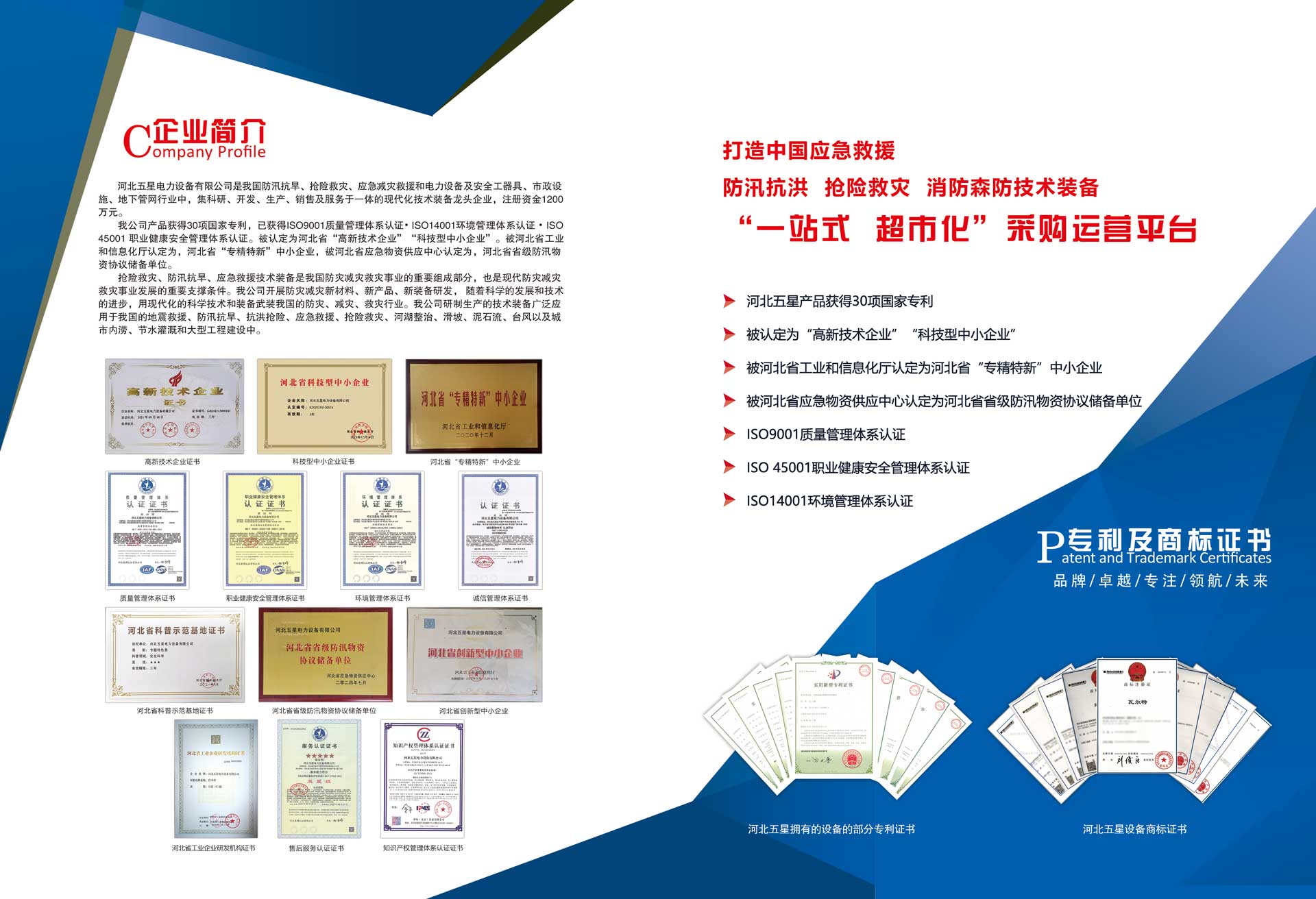 河北五星電力設(shè)備有限公司是我國防汛抗旱、搶險救災(zāi)、應(yīng)急減災(zāi)救援和電力設(shè)備及安全工器具、市政設(shè)施、地下管網(wǎng)行業(yè)中,集科研、開發(fā)、生產(chǎn)、銷售及服務(wù)于一體的現(xiàn)代化技術(shù)裝備高新技術(shù)企業(yè),注冊資金1200萬元。  我公司產(chǎn)品已獲得ISO9001質(zhì)量管理體系...